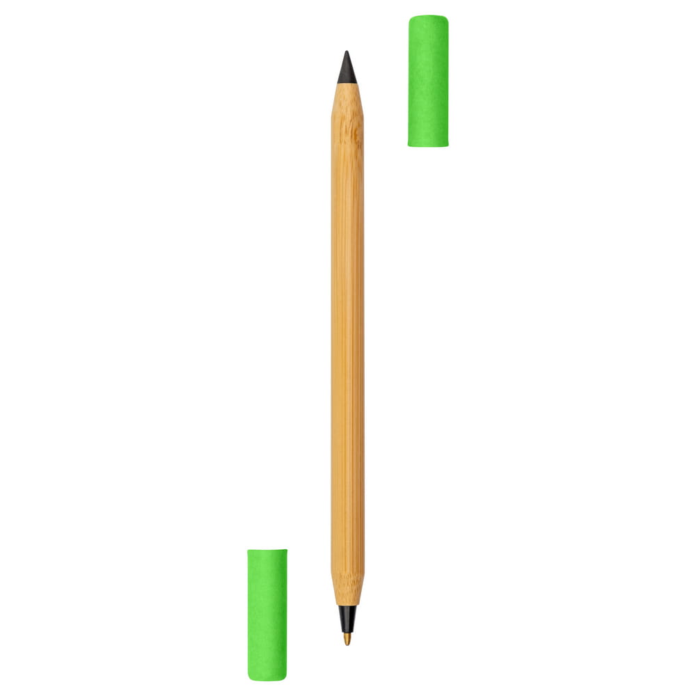 Długopis 2 w 1, "wieczny" ołówek, dzięki wykorzystaniu specjalnej wolnościerającej się końcówki długość pisania ołówka to około 1500 metrów, naostrzony, bambusowy trzon, dwie kolorowe zatyczki wykonane z papieru