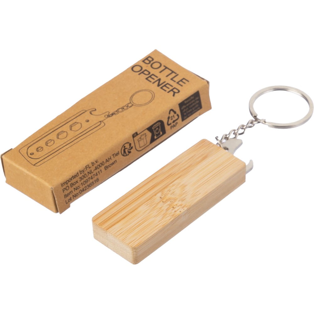 Brelok do kluczy, otwieracz do butelek, dodatkowo posiada 4 klucze płaskie, może przydać się podczas plenerowych wypadów, zapakowany w kartonik, produkt wykonany z bambusa