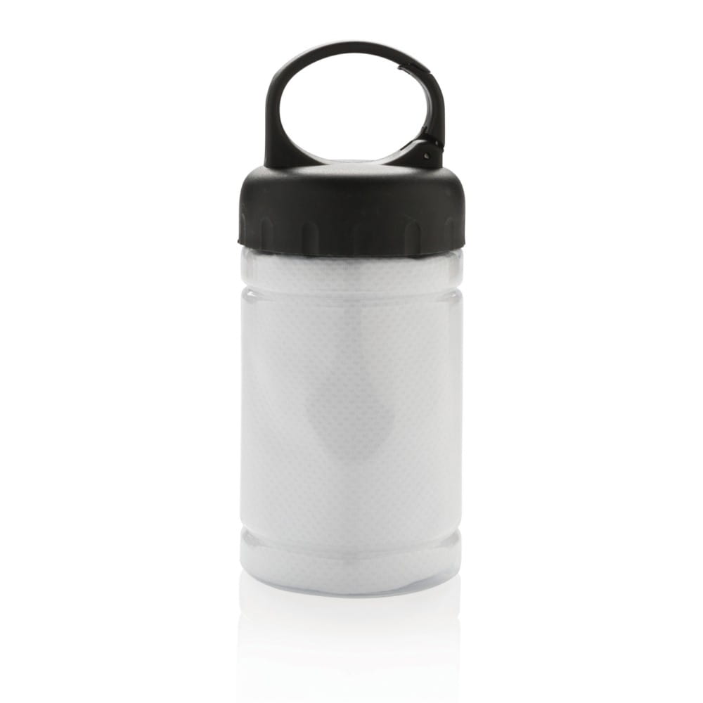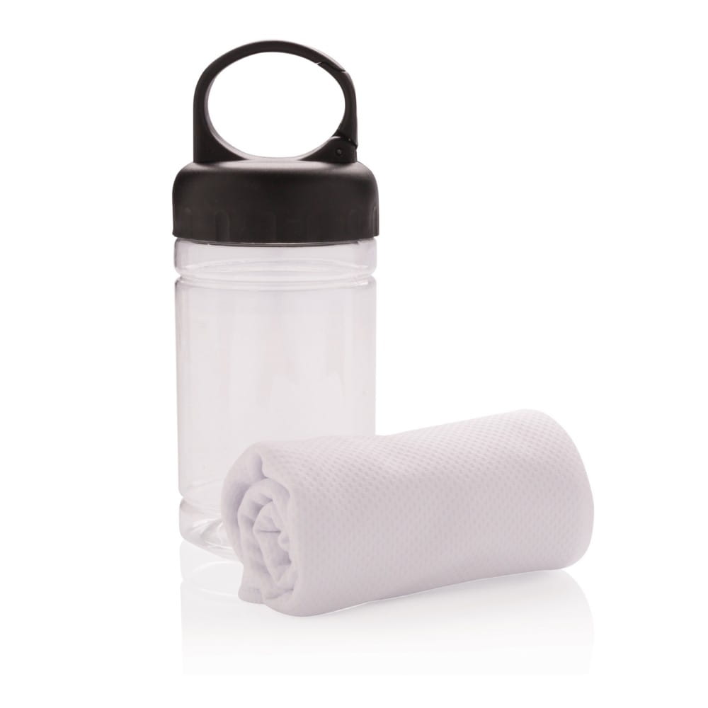 Ręcznik chłodzący w 100% wolny od substancji chemicznych, mikrofibra, posiada funkcję ochrony przeciwsłonecznej - blokuje promienie słoneczne na poziomie 98% i do UV 50+. Wystarczy wlać zimnej wody do pojemnika, co doda ręcznikowi funkcję chłodzenia, i szybki sposób na odświeżenie gotowy. Pojemnik wykonany z PP, górna część ABS, posiada karabińczyk, dzięki czemu można go zabrać ze sobą podczas aktywności na świeżym powietrzu.
