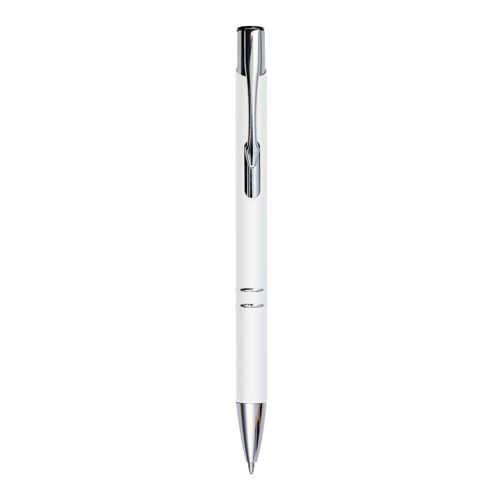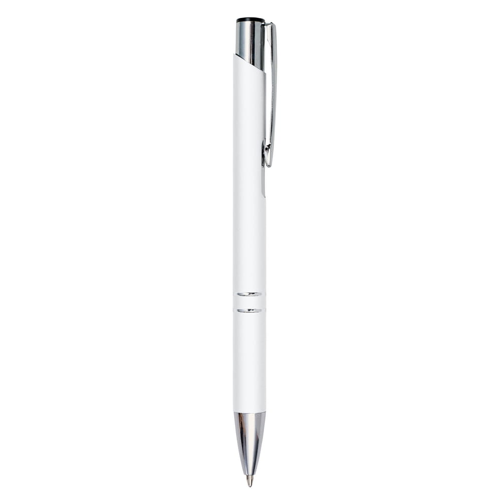 Długopis z gumowanym wykończeniem i srebrnymi elementami, grawer ukazuje lustrzaną powierzchnię.