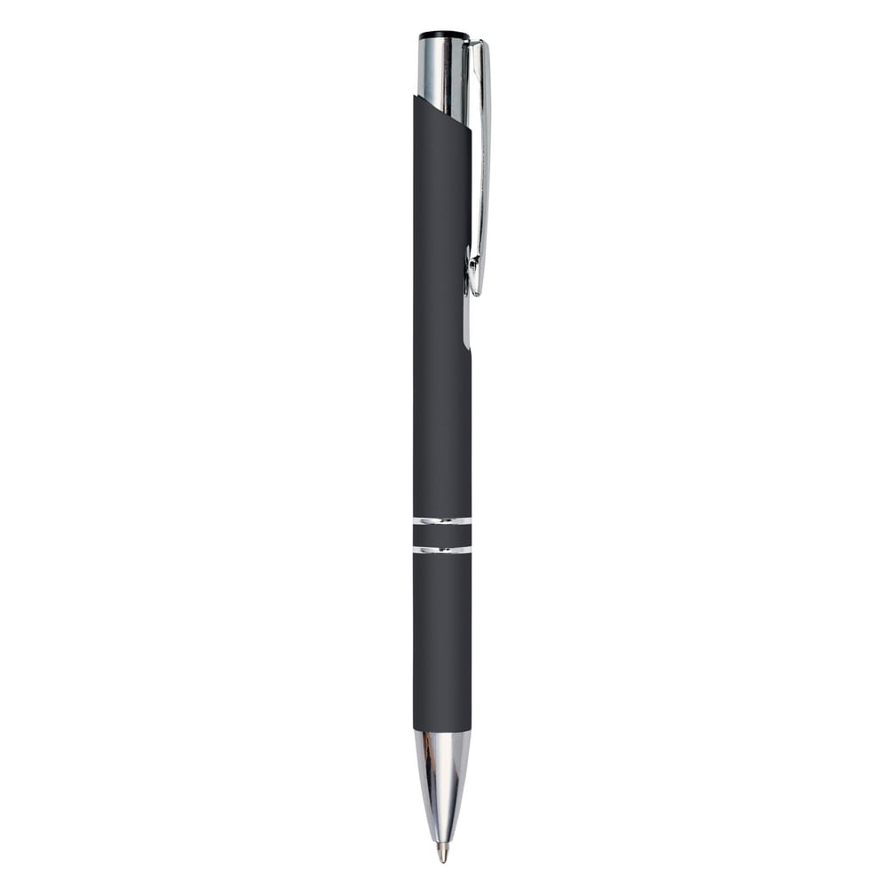 Długopis z gumowanym wykończeniem i srebrnymi elementami, grawer ukazuje lustrzaną powierzchnię.