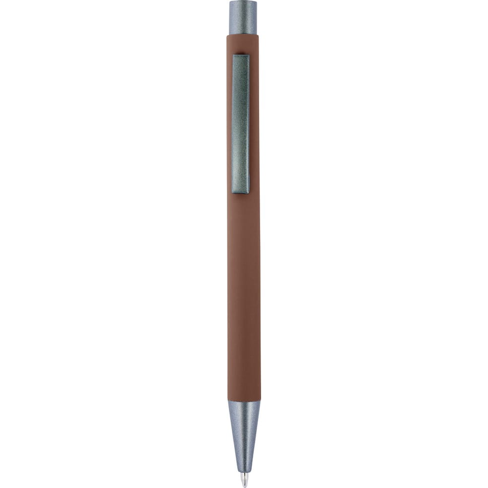 Długopis z kolorowym, gumowanym trzonem i szarymi elementami, grawer ukazuje lustrzaną powierzchnię.