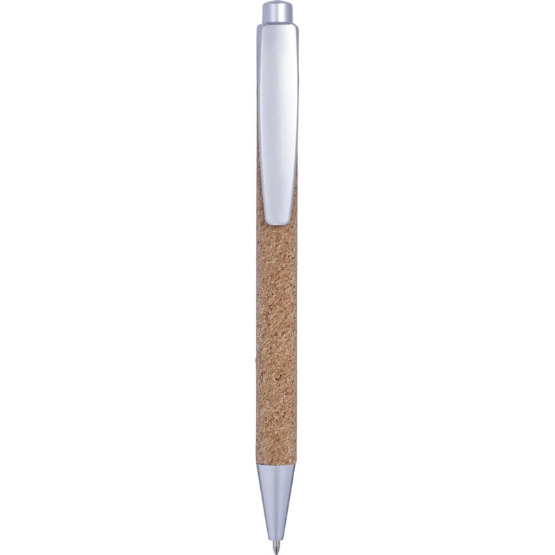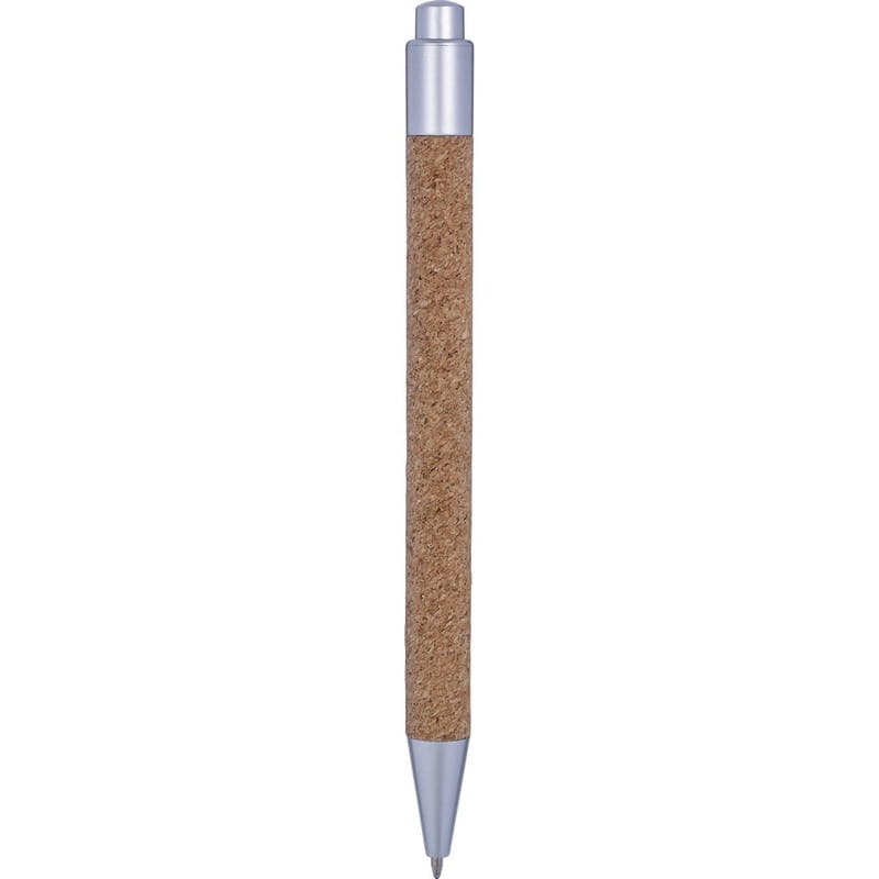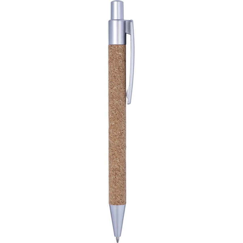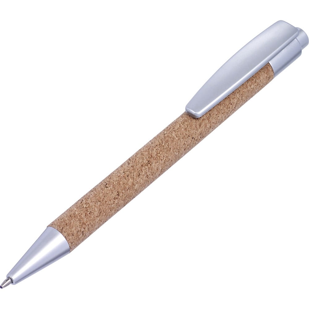 Długopis, korkowy trzon, srebrne plastikowe elementy korpusu.