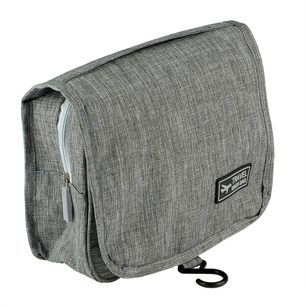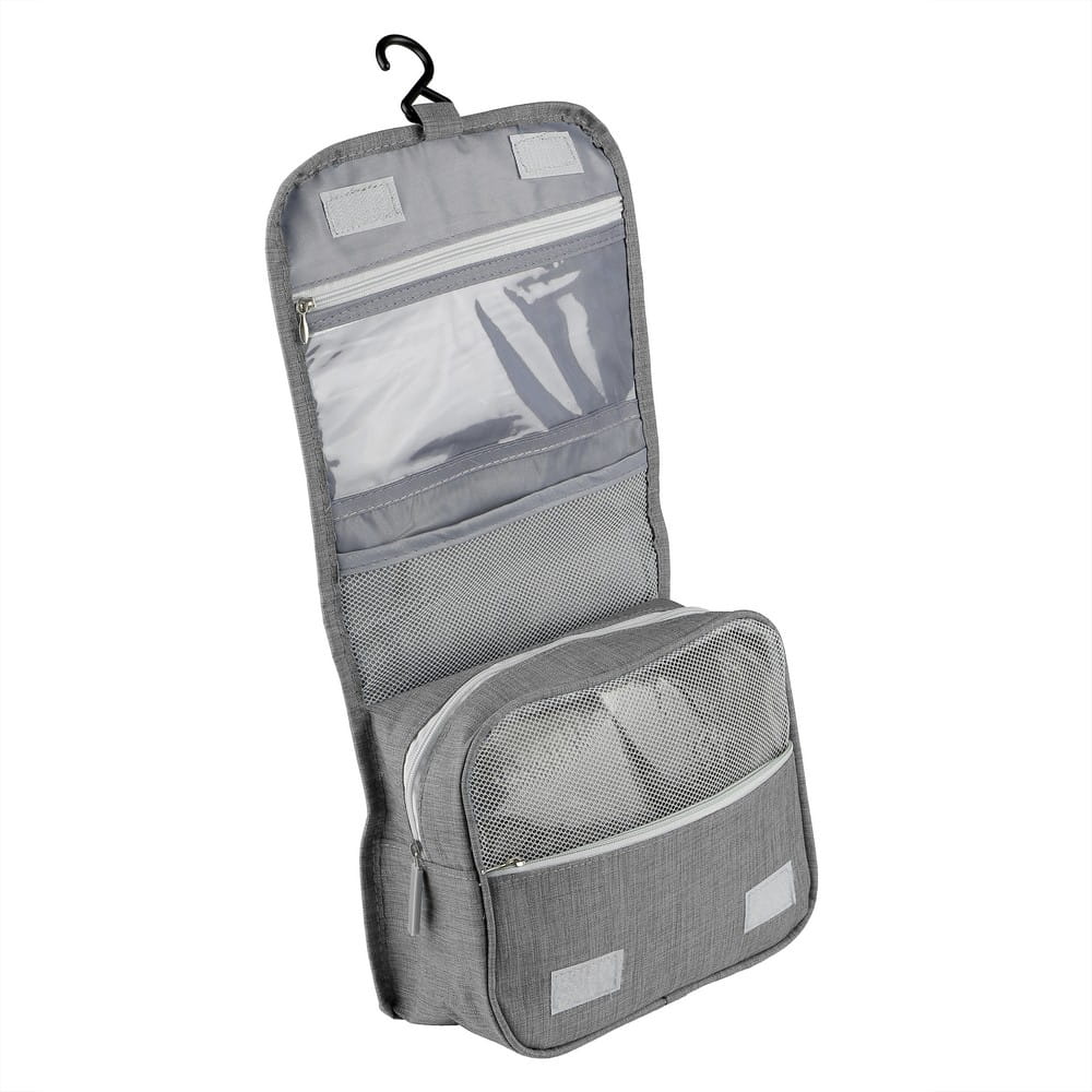 Kosmetyczka z wieloma przegrodami, przegroda główna na zamek błyskawiczny, 1 kieszeń siateczkowa, przezroczysta kieszeń oraz kieszeń przednia na zamek błyskawiczny, haczyk do powieszenia w komplecie.