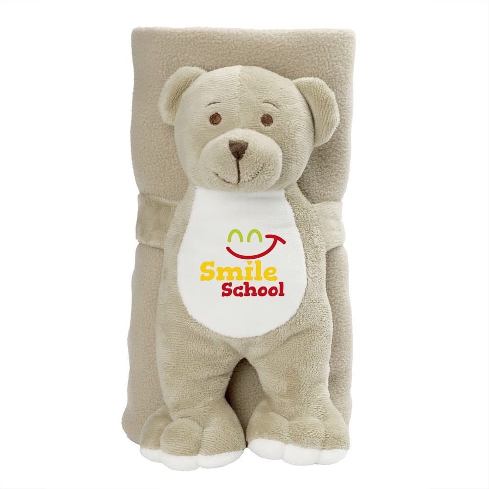 Phil, pluszowy miś z kocem HE771-20 Miś z kocem (po rozłożeniu 100 x 80 cm) Wymiary: 25 cm Materiał: plusz, poliester Ten produkt znakujemy termotransferem - TF3