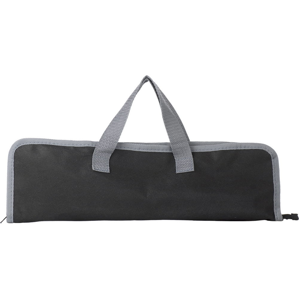 Zestaw do grilla 3-elementowy w pokrowcu, wewnątrz: szczypce, łopatka i widelec. Wymiary: 40 x 12 x 3,5 cm. Materiał: stan nierdzewna, non-woven. Technika znakowania: grawer laserowy. Jeśli masz pytania dotyczące produktu lub zamówienia innego nakładu, skontaktuj się z nami.