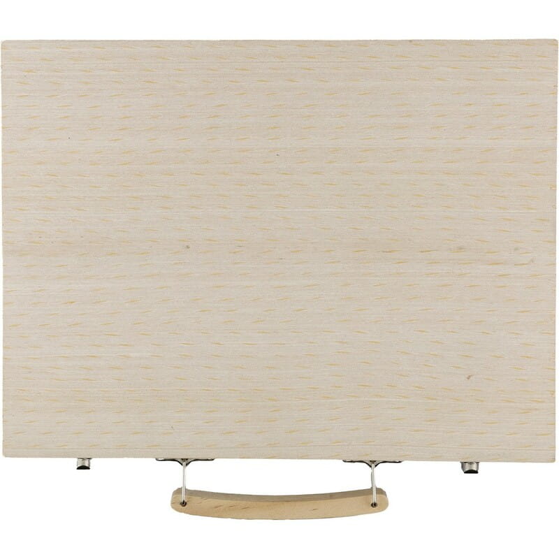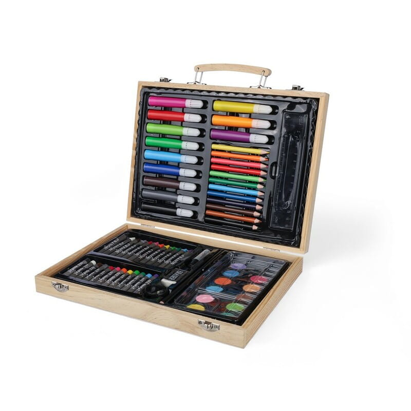 Zestaw do rysowania ze sklejki w sosnowej skrzynce z drewnianą rączką, zawierający 66 elementów: 12 kredek woskowych, 12 kredek ołówkowych (naostrzonych), 12 pisaków, 12 pasteli olejnych, klej w sztyfcie, gumkę do ścierania, temperówkę, linijkę, pędzel, 12 farb, paletę, pakowany pojedynczo w brązowe kartonowe pudełko