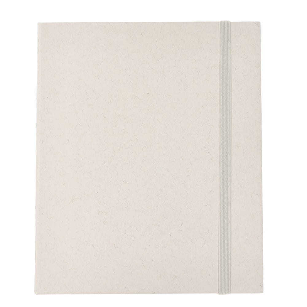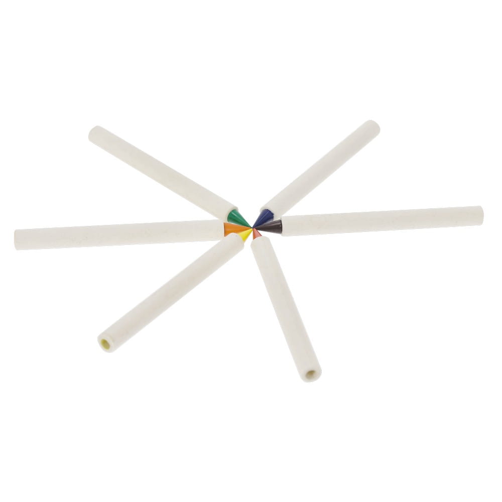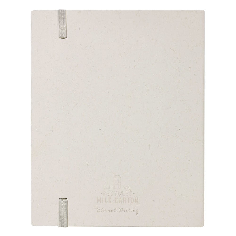 Zestaw 6 kredek, gumka do ścierania, notatnik z 50 pustymi kartkami, dodatkowe zamknięcie w postaci dopasowanej kolorystycznie elastycznej opaski, ikona zrecyklingowanych kartoników po mleku na produkcie, produkt wykonany ze zrecyklingowanych kartoników po mleku