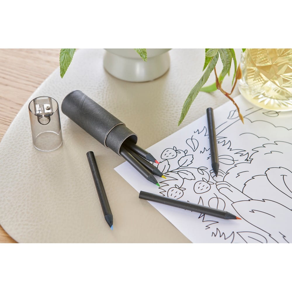 Zestaw 6 kredek z ozdobnym czarnym trzonem, zapakowane w czarny kartonik z recyklingu