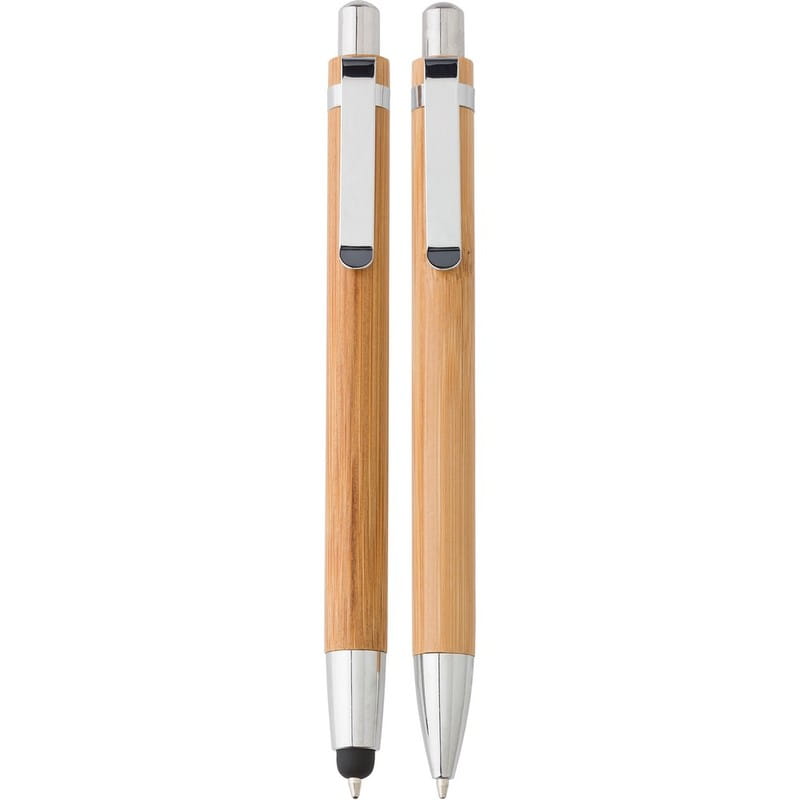Zestaw piśmienny w etui, długopis, touch pen i ołówek mechaniczny ze srebrnymi elementami. Materiał: bambus, karton, metal. Wymiary: 17 x 4,1 x 2,5 cm. Technika znakowania: tampodruk /T1/. Jeśli masz pytania dotyczące produktu lub zamówienia innego nakładu, skontaktuj się z nami.